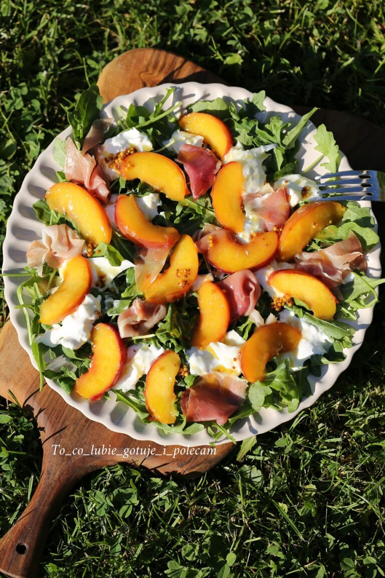 Lekka sałatka z burratą i karmelizowanymi nektarynkami.
