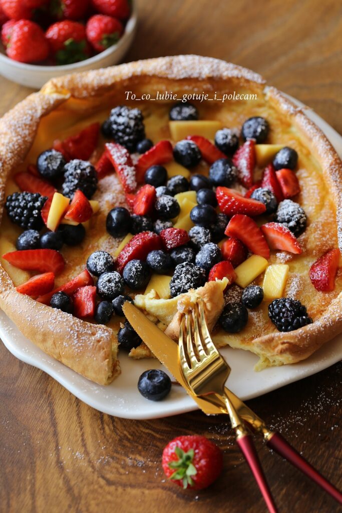 Dutch baby delikatny, puszysty pieczony naleśnik. Idealny naleśnik, który zachwyci Was swoim smakiem, sprawdzi się na pyszne, niedzielne śniadanie. Z dodatkiem owoców, jogurtu jest wyjątkowo smaczny.