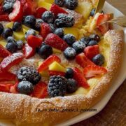 - Upieczony naleśnik wyjmujemy z formy, oprószamy cukrem pudrem, dodajemy ulubione owoce. Można dodać również jogurt, całość polać syropem klonowym lub miodem, ( ale to już wg uznania).