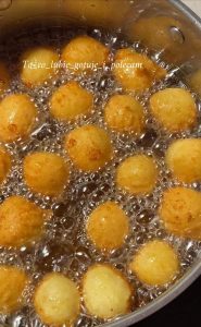 - Przekładamy do rękawa cukierniczego i wyciskamy małe mini pączusie do rozgrzanego garnka z olejem lub smalcem. Odcinamy nożyczkami.