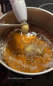- Smażymy na rozgrzanym oleju, pączki same się odwracają, ale jeśli któryś nie będzie miał ochoty pomagamy mu widelcem.